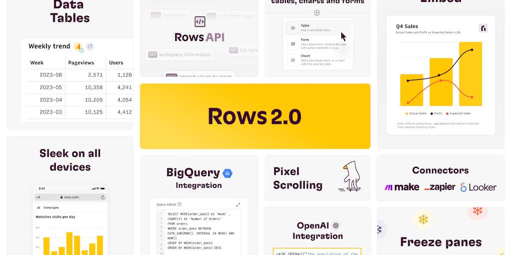 The biggest update to Rows yet. 🖋️ New spreadsheet editor 🔑 REST API, Zapier, Make, and Looker connectors ⚙️ New integrations with BigQuery and OpenAI 📊 Redesigned charts, with descriptions and footno