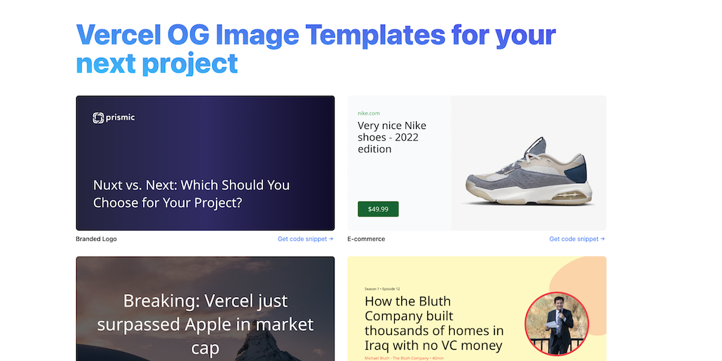 You can quickly grab the code snippet for one of our Vercel OG templates, customise it however you want and start generating dynamic Open Graph images for your blog, product or podcast website.