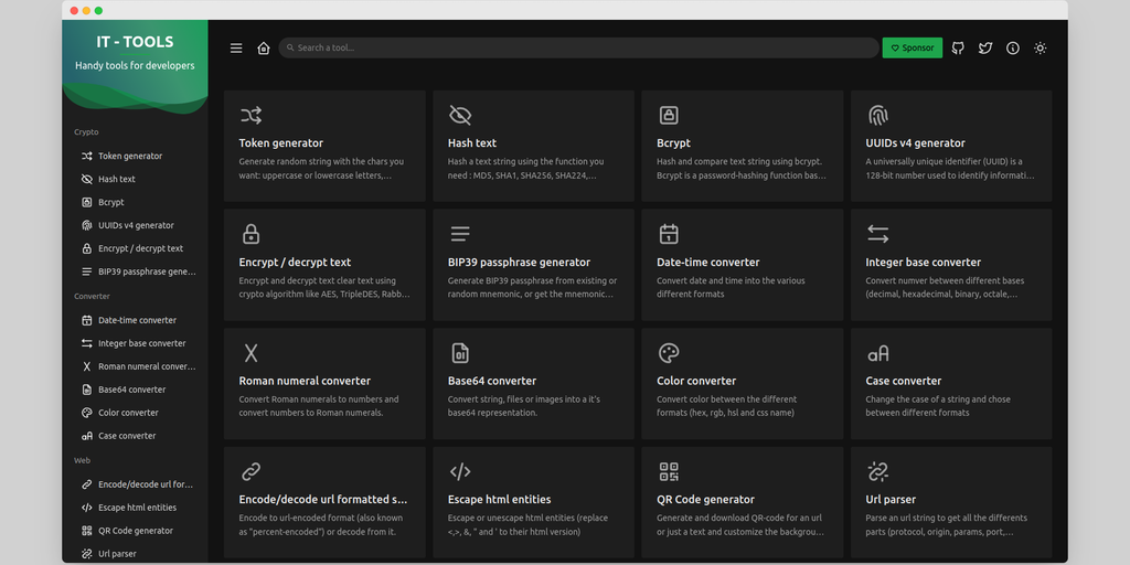 IT Tools is a free and open-source collection of handy online tools for developers & people working in IT. It includes a token generator, case converter, base converter QR code generator, Git cheatshe