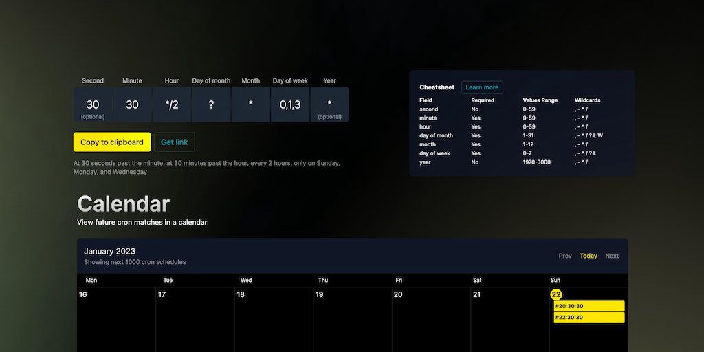 A free tool to debug, edit, learn and view crontab/cron expressions. Write cron schedules with ease - no registration required. A new, visual way to explore one or more crons with extended cron syntax