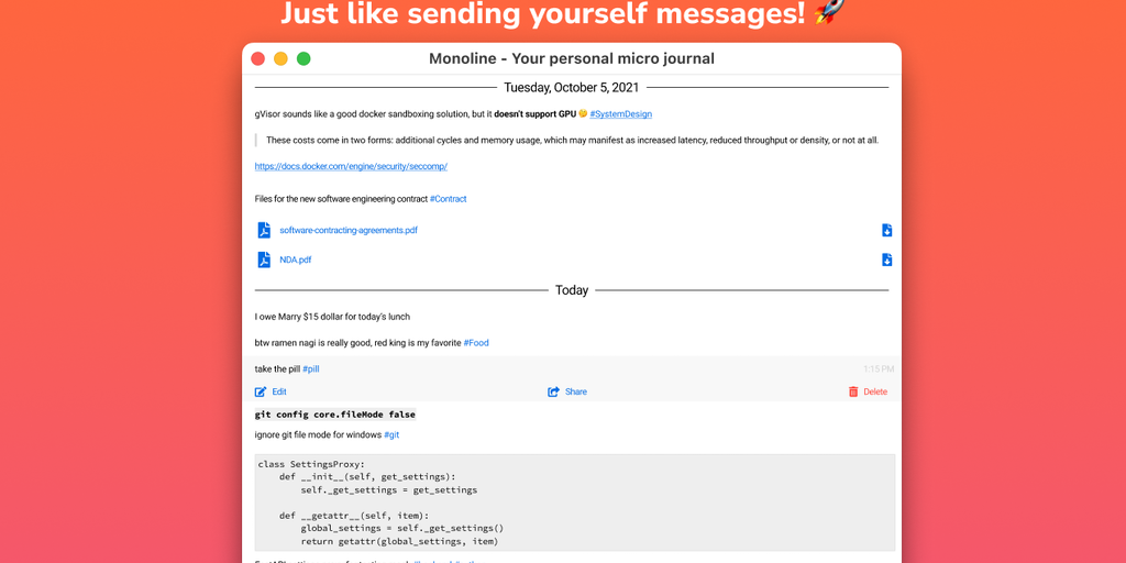 Monoline is a messenger-like app only for sending messages to yourself. Notes sync across multi-platforms like iOS, Android, Web, Mac, Windows, and Linux in real-time. You can share files easily acros