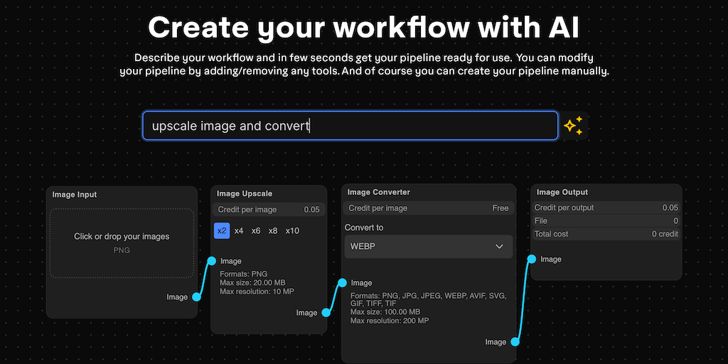 Automation for creators. Easily build custom pipelines either manually or with AI assistance. From generating inspiration boards to applying batch editing on your files or creating multiple AI images