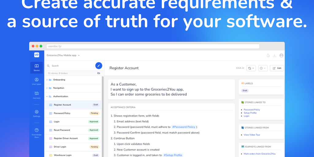 Most software projects fail due to poor requirements, Userdoc empowers your team with sophisticated AI that ensures your project has the best chance of success. Generate user stories, personas, and us