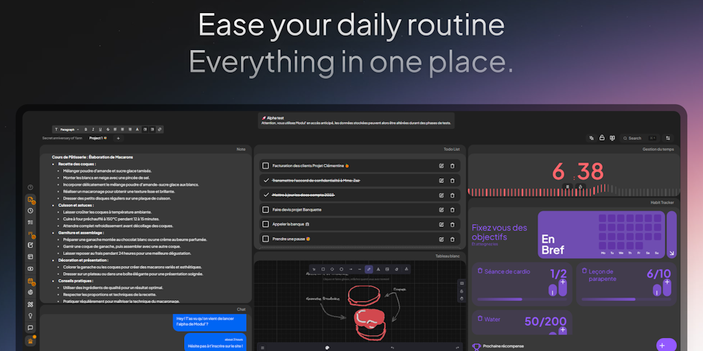 Modul' is your all-in-one platform for effortless task management, integrating tools like pomodoro timers, chat and much more. Ideal for both personal organization and team collaboration, it elevates