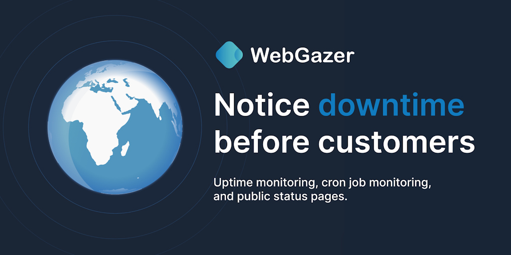 Monitor websites, APIs, cron jobs, and more with ease. Get real-time alerts for downtime, performance issues, and SSL problems. Enjoy a customizable status page. Try WebGazer: Your free, comprehensive