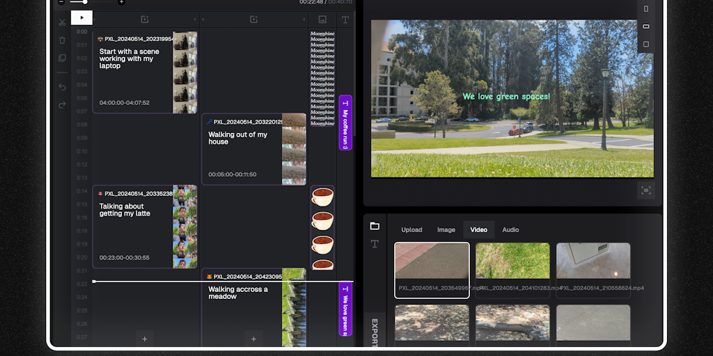 Type your story to edit your video. Moonshine enables a fundamentally new and simpler way to create videos. Watch your relevant media float into your timeline as we find what you're looking for and br