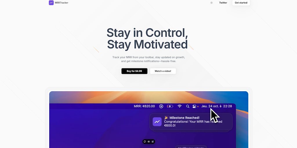 MRRTracker is a simple macOS app that tracks your Monthly Recurring Revenue (MRR) from your toolbar, providing real-time updates, milestone notifications, and insights in a minimalist interface.