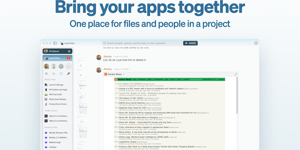 Muddy makes working on projects together easy. A single place to bring all your apps together with AI-powered organization. View projects on a multiplayer timeline and rewind to any point in time. Ava
