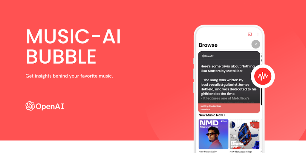 Music AI elevates your music listening experience with behind-the-song trivia. - Detects the currently playing song on your phone. - A floating bubble overlays instant insights about the song. - Works
