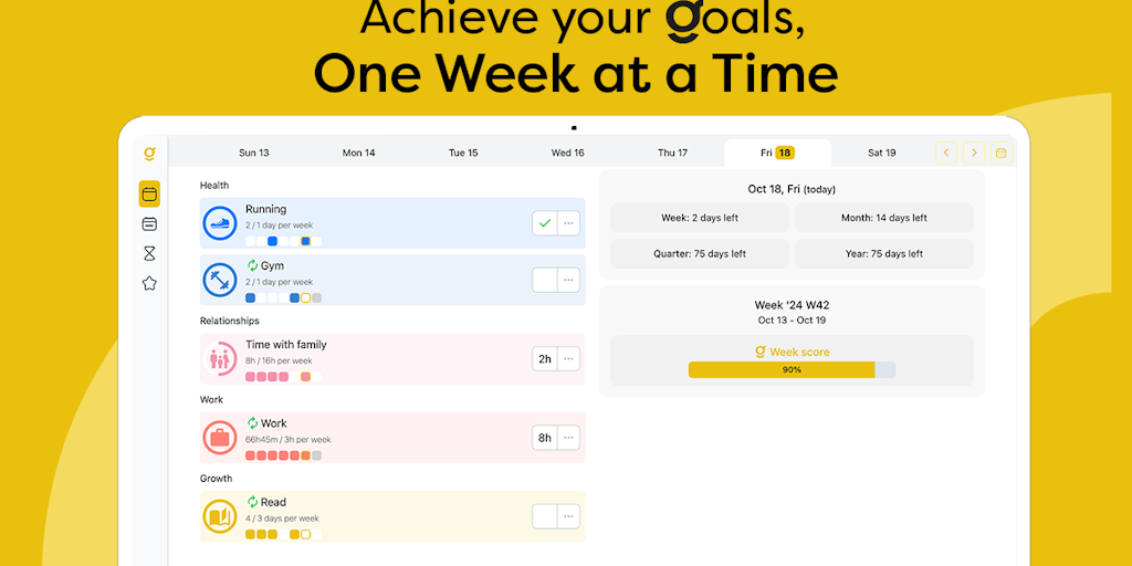 My Good Week helps you achieve long-term goals by breaking them into weekly activities. With automatic tracking via Google Calendar, weekly reviews, and deep insights, it’s the most comprehensive habi