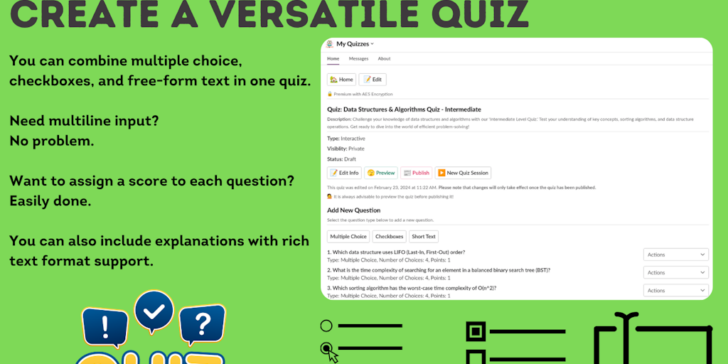 My Quizzes is the ultimate Slack-native quiz app, allowing you to create quizzes directly within Slack. You can run quizzes in interactive mode, similar to Kahoot!, or in standard mode, where particip
