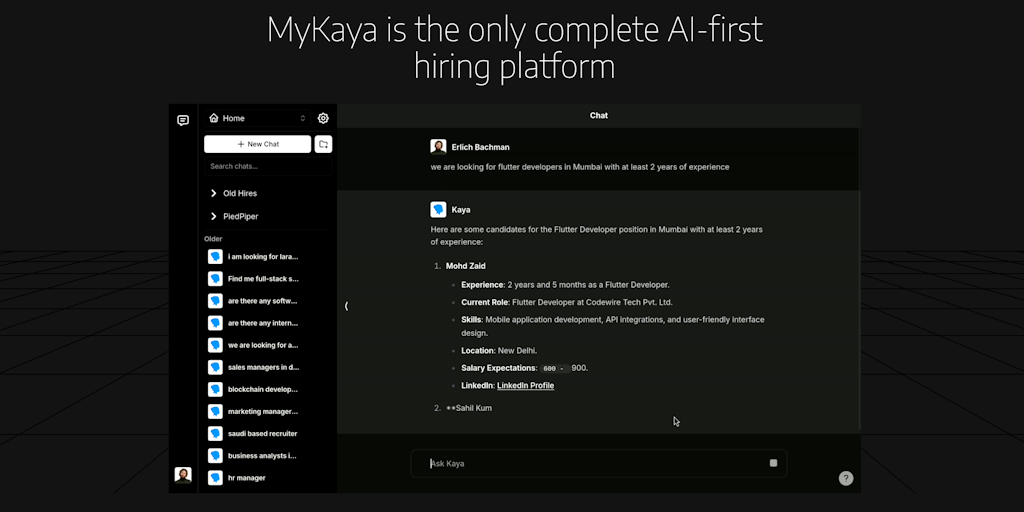 MyKaya is an AI-powered hiring tool that simplifies recruitment. It matches companies with top talent using ChatGPT-like interactions. Type your job requirements, and MyKaya finds ideal candidates, st