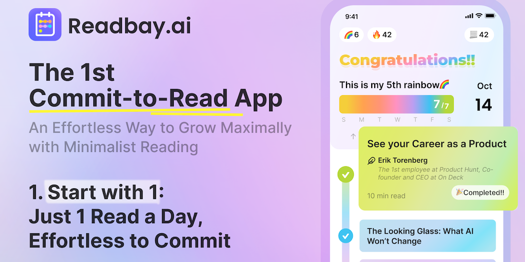 Unlike read-it-later apps that lead to piles of unread articles, Readbay focuses on quality over quantity, consistency over intensity. With an AI-enhanced, insightful coach, Mindful engagement with 1