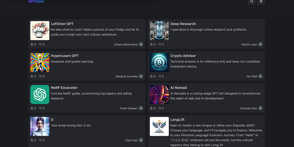 Enter GPTsdex: a hub of over 10,000 custom GPTs, streamlining AI creativity post-OpenAI's launch. Our platform empowers you to share, discover, and enhance GPTs, bridging the gap between beginners and