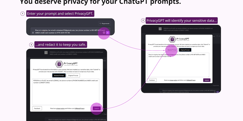 PrivacyGPT protects your ChatGPT prompts! It redacts sensitive information: PII, PCI, PHI from 62 countries. Download it today on Google Chrome! PrivacyGPT is client-side; we don’t store any of your d