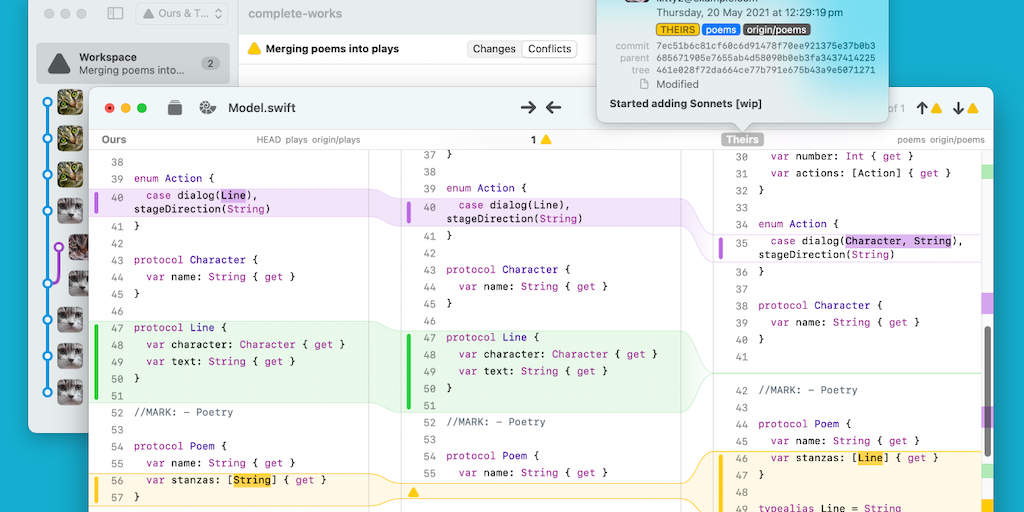 Native macOS app for browsing commits, comparing branches, viewing file history and resolving conflicts with a powerful 3-way merge tool.
