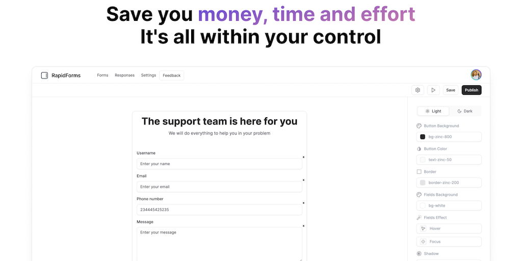 RapidForms allows you to create beautiful, customized forms effortlessly. No coding or design skills needed. Focus on what matters most. Build, embed, and match your style with ease.