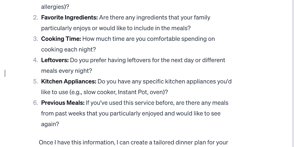 This GPT (using OpenAI's new GPT platform) helps your family plan out a weekly dinner menu, taking into consideration family preferences, how many nights you're cooking, and whether or not you want le
