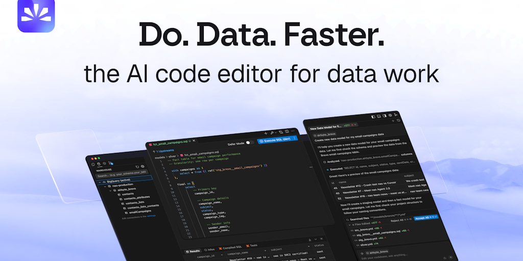 Nao is an AI powered data IDE for analysts, engineers, and scientists to write SQL, Python, or dbt workflows, preview changes, catch issues early, and deploy confidently. It connects directly to your