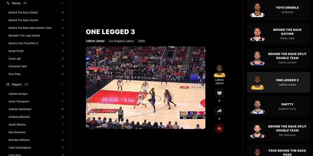 The definitive archive of every signature move in basketball. Swipe through a vertical feed of videos. Click on a move to see how different players do it. Click on a player to see their entire bag.