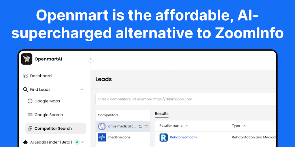 Openmart is the affordable, AI-supercharged alternative to ZoomInfo. It helps startups discover clinic, retail, and e-commerce leads in seconds.