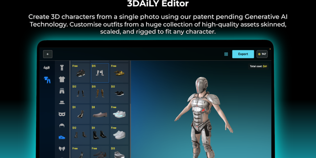 3DAiLY platform fuelled by Generative AI, elevates the asset creation and monetisation capabilities of Game Studios, Indie Developers, 3D Artists, offering: 1. 3D Editor 2. SDK for In-Game Character P