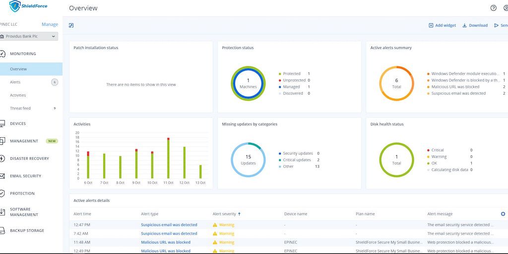 ShieldForce combines an AI powered detection engine, advanced email security, automated patch management, automated safe disaster recovery, threat intelligence capabilities and advanced data loss prev