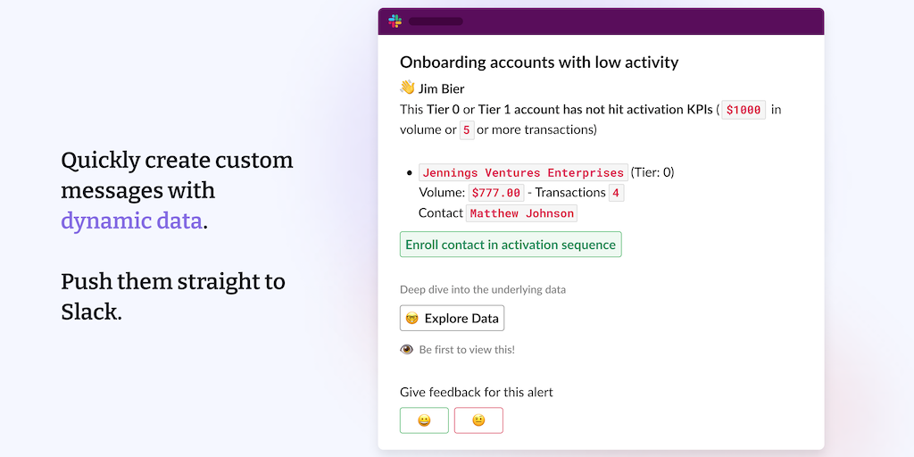 Send custom, data-driven alerts to Slack or email so you can track any metric or event in your data—no code, SQL, or eng required. Not sure where to start? Use our anomaly detection for monitoring & A