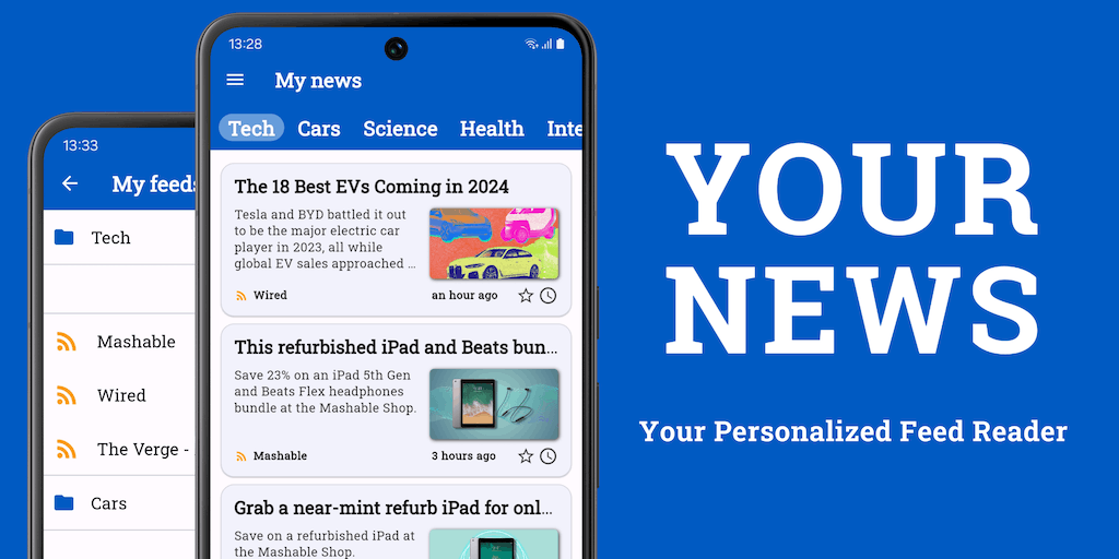Your News is a Personal Feed reader designed to be simple and effective. Customize categories, add your RSS and YouTube feeds, search for feeds, bookmark favorite articles, and mark content to check l