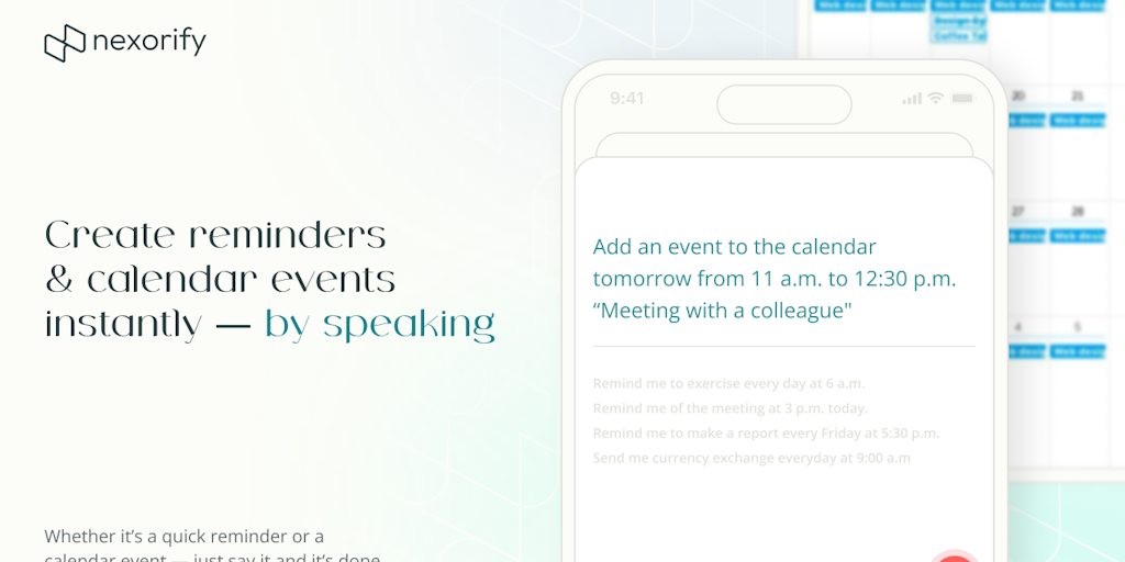 Nexorify turns your voice into instant reminders and calendar events — no typing, no friction. Just say, “Create a calendar event tomorrow from 10 to 11 AM, ‘Meeting with a colleague,’ and remind me 3