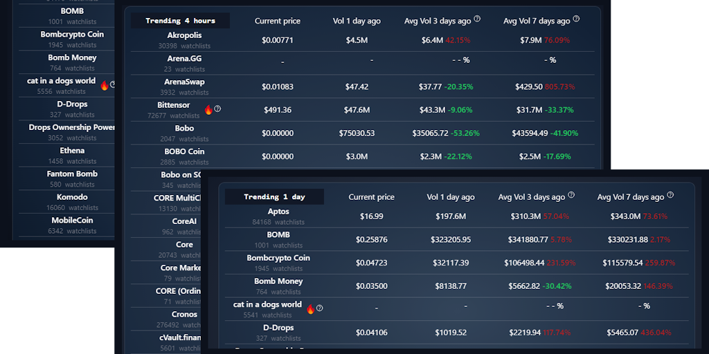 We track Cryptocurrencies that are trending on Google Trends for 1 hour, 4 hours and 1 day ago. We also provide the average volumes for 1 day, 3 days and 7 days. Comparing all this info make possible