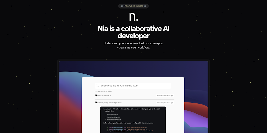 Nia AI is a context-aware coding teammate that knows your entire codebase for instant architecture insights, multi-file references, automated code reviews, and Slack collaboration—supercharged by adva