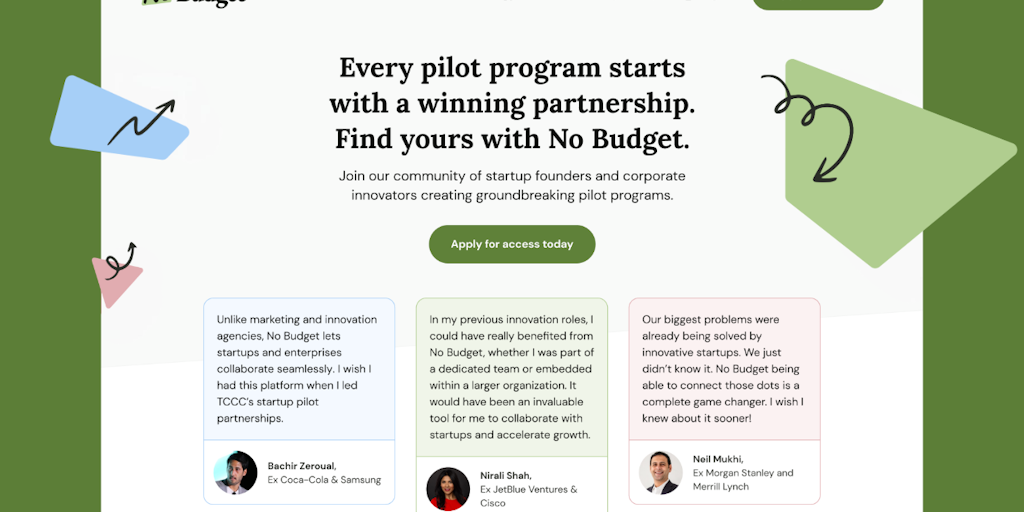 Find your ideal pilot program partner with No Budget. Join our community of startup founders and corporate innovators.