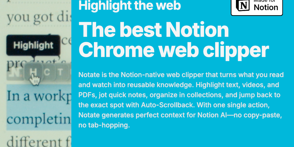 Highlight text, videos, and PDFs, jot quick notes, organize in collections, and jump back to the exact spot with Auto‑Scrollback. With one single action, Notate generates perfect context for Notion AI