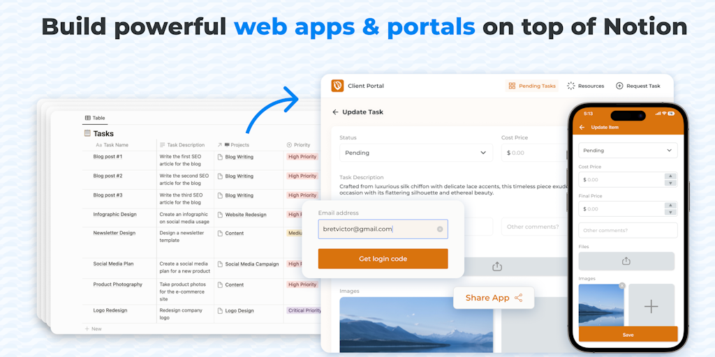 The easiest way to build web apps on top of Notion. Build and customize with lists, menus, forms, login, user permissions and 40+ components. Be it client portals, internal tools, vendor apps, member