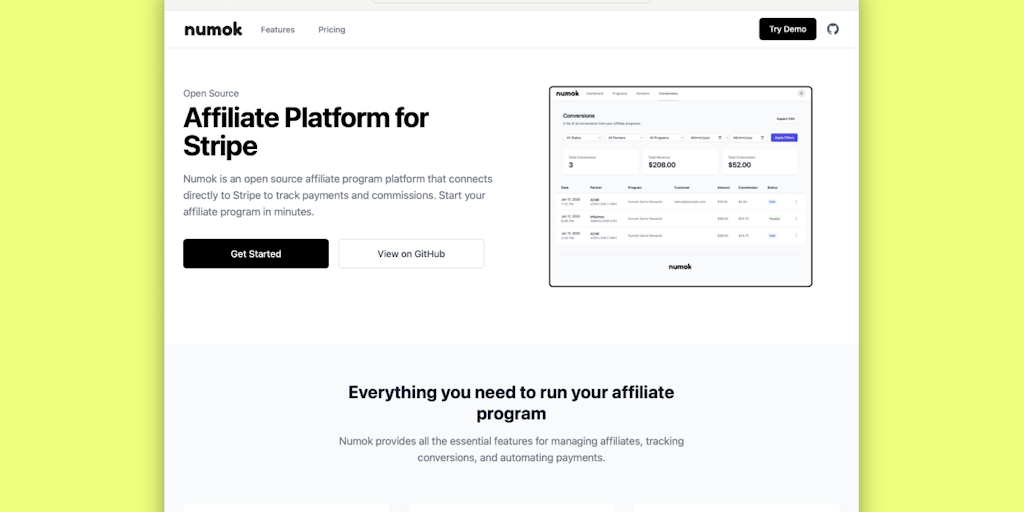 Numok is an open-source affiliate program platform that integrates seamlessly with Stripe to track payments and commissions. ⚡ Launch your affiliate program in minutes—self-host it or use our cloud ve