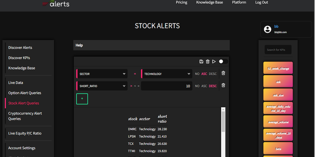 Query our options / stocks / crypto database, build alert queries on top and get SMS / E-Mail / App alerts whenever your query rules apply. Access to the platform for trial is free. Alerts cost.