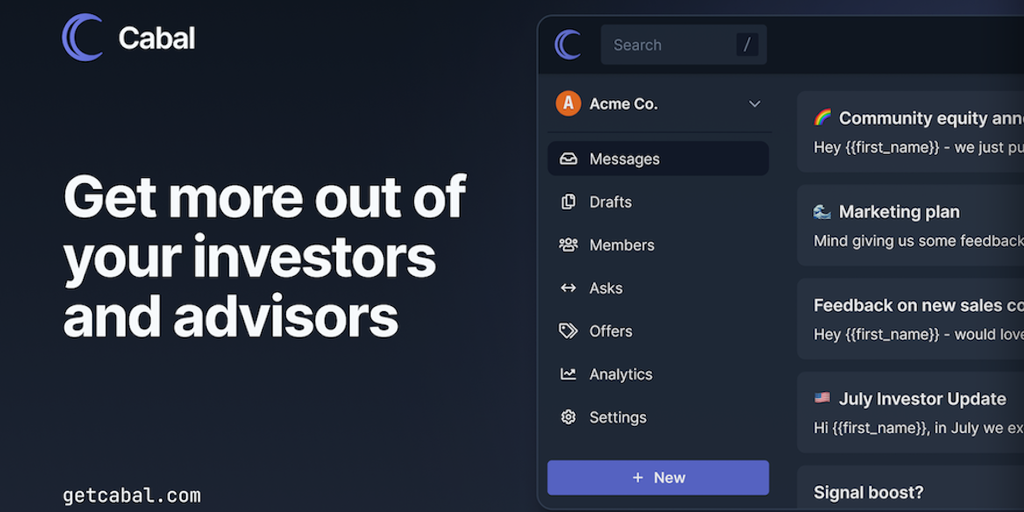 Cabal helps founders and their teams get more out of their investors and advisors by making it easy to surface what they need—and even easier for investors to contribute.