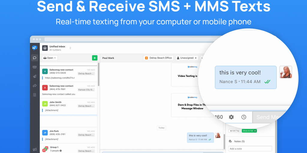 Salesmsg is an all-in-one business texting and calling platform designed to make messaging easy for sales, marketing, and support teams. Send & receive SMS, MMS, videos, PDF's, vCards, even animated g