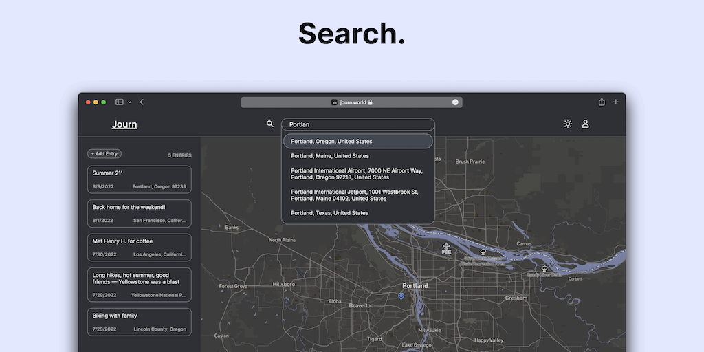 Journ catalogs your writing to an interactive map, allowing you to easily visualize and access all previous work. Make memories and keep them, too.