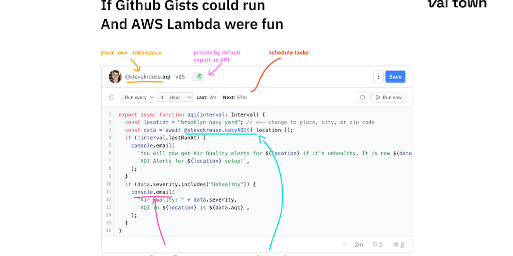 Val Town - If GitHub Gists could run, and AWS Lambda were fun | Product Hunt