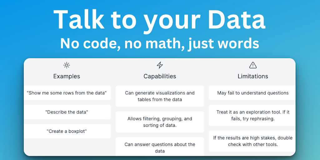 Chat with your data in plain English and get instant answers, calculations, and graphs. Analyze your data without any coding skills. Generate graphs and charts to visualize your data. Share your insig