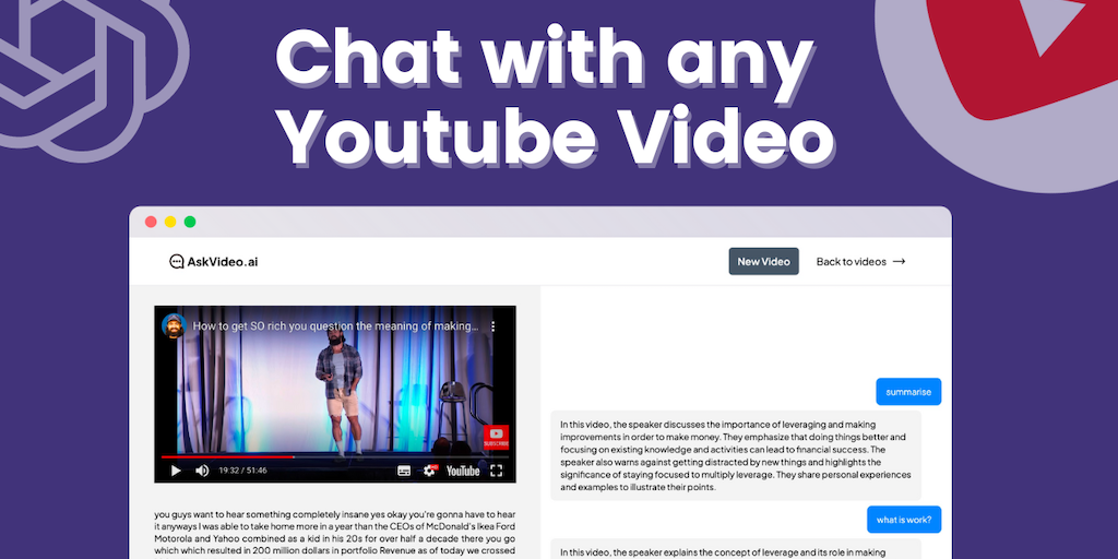 From training tutorials to recorded webinars, AskVideo.ai infuses your videos with AI brilliance. Pose questions, obtain highlights, extract insights, and delve deeper—all within your video content.