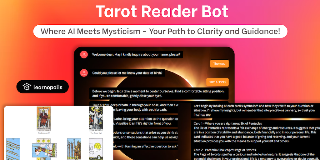 Whether you're seeking clarity about love, career, or life's twists and turns, just simply ask a question or choose a spread, Tarot Reader Bot is here to provide you with thoughtful insights that can