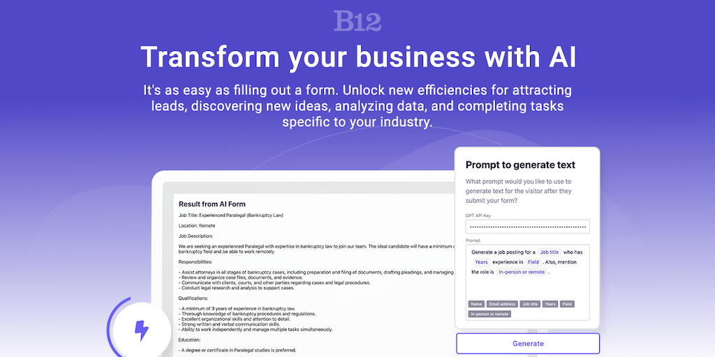 With B12’s No-code AI, anyone – regardless of tech skills— can quickly and easily add automation to processes like attracting leads, brainstorming ideas, and creating drafts. Build a custom tool or us
