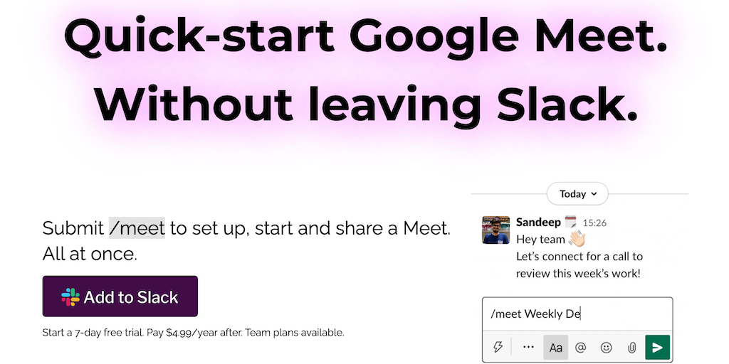 Setting up meetings is a pain. With Meet for Slack, submit /meet in Slack to set up, start and share a Google Meet. All at once. With ChatGPT, now Meet for Slack is like talking to your very own perso