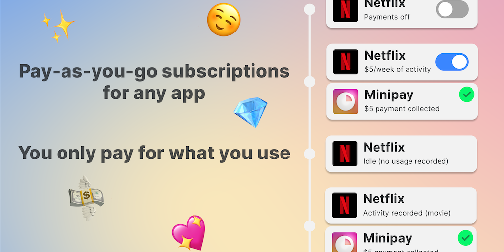 Subscriptions reimagined. With Minipay, you only pay for what you use. No commitments. No contracts. Pause or cancel your subscriptions whenever you like. ⚡️