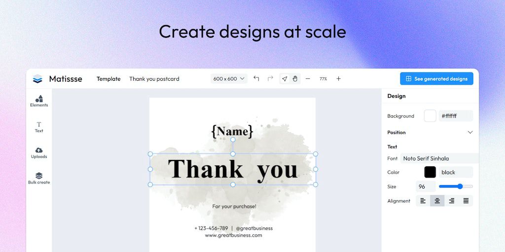 Matissse is a time-saving tool for generating multiple versions of the same design. Ideal for creating business cards, invitations, certificates, social media content, and designs with minimal text ch