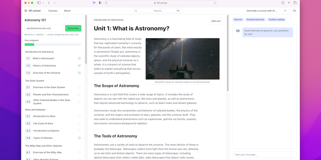 Have you ever wanted to teach yourself something? 101.school will use GPT-4 to generate a multi-week course on whatever you're interested in. We'll then send you a regular email, drip-feeding you the