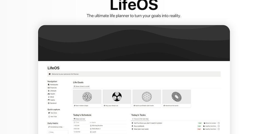 LifeOS is a powerful blend of a life planner, second brain, and finance system, created to handle all your personal management and planning needs.